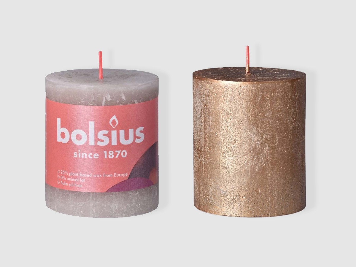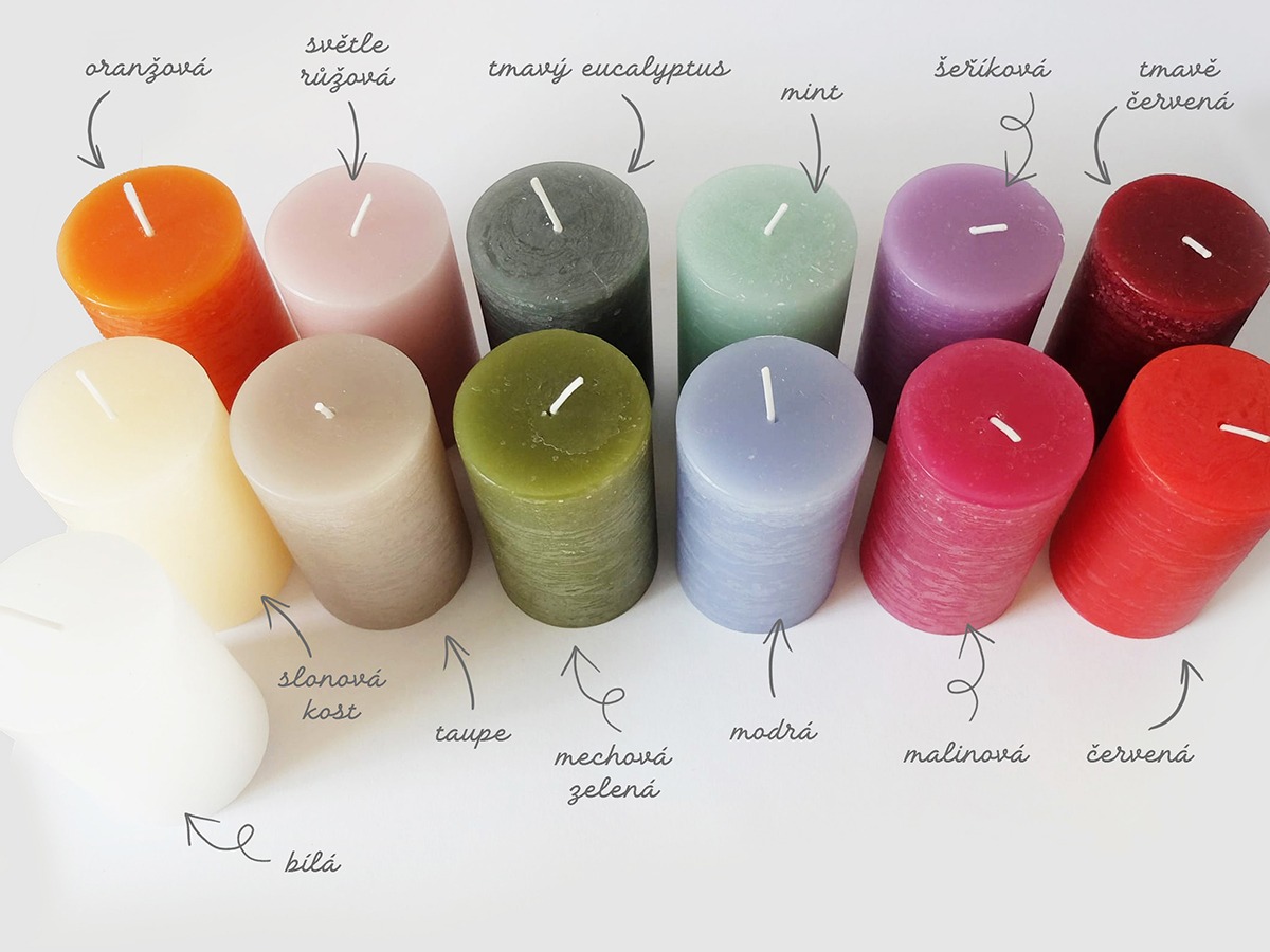 Za mě jsou jednoznačnou volbou svíčky rustikální. Mají řemeslný vzhled, surovou přírodní texturu vosku a ostré hrany. Letos jsem se však rozhodla vyměnit značku Bolsius za svíčky české výroby. Mají maličko jiné rozměry – 60 x 100 mm, takže jsou trochu užší a vyšší než “klasická” velikost od Bolsius, kterou jsem doteď používala (68 x 80 mm). Ale protože mi u nich v sortimentu chybí dvě barvy – metalická zlatá a světle šedá – na přání tyto dvě barvy mohu objednat opět od značky Bolsius.